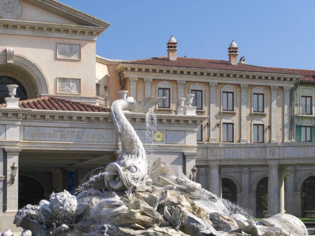 The Tokyo DisneySea Hotel MiraCosta is located above the Mediterranean Harbor port in Tokyo DisneySea. The hotel is themed after the ports of Portofino and Venice.